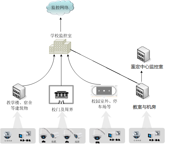 (5)視頻監控系統主要由前端攝像機組成,根據現場不同的環境和應用選用不同的攝像機,在出入口選擇紅外攝像機,在樓梯口和走廊設置紅外槍式攝像機及寬動態紅外攝像機,在周界可以選用紅外槍式攝像機,在學院室外開闊區域選用室外球型攝像機等。