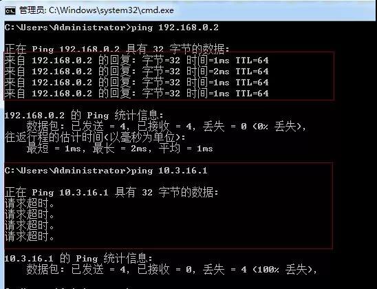 比如:ping 192.168.0.2就是通的,而ping不在同一個網(wǎng)段的10.3.16.1就不同,如下圖: